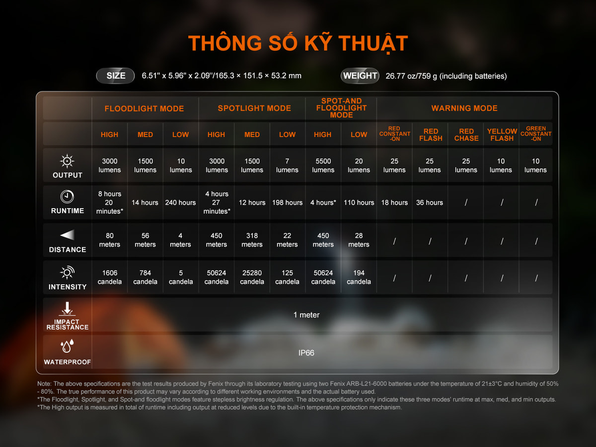 Chi tiết về độ sáng, tầm chiếu và thời lượng hoạt động ở từng mức sáng được thể hiện trong bảng Runtime dưới đây: