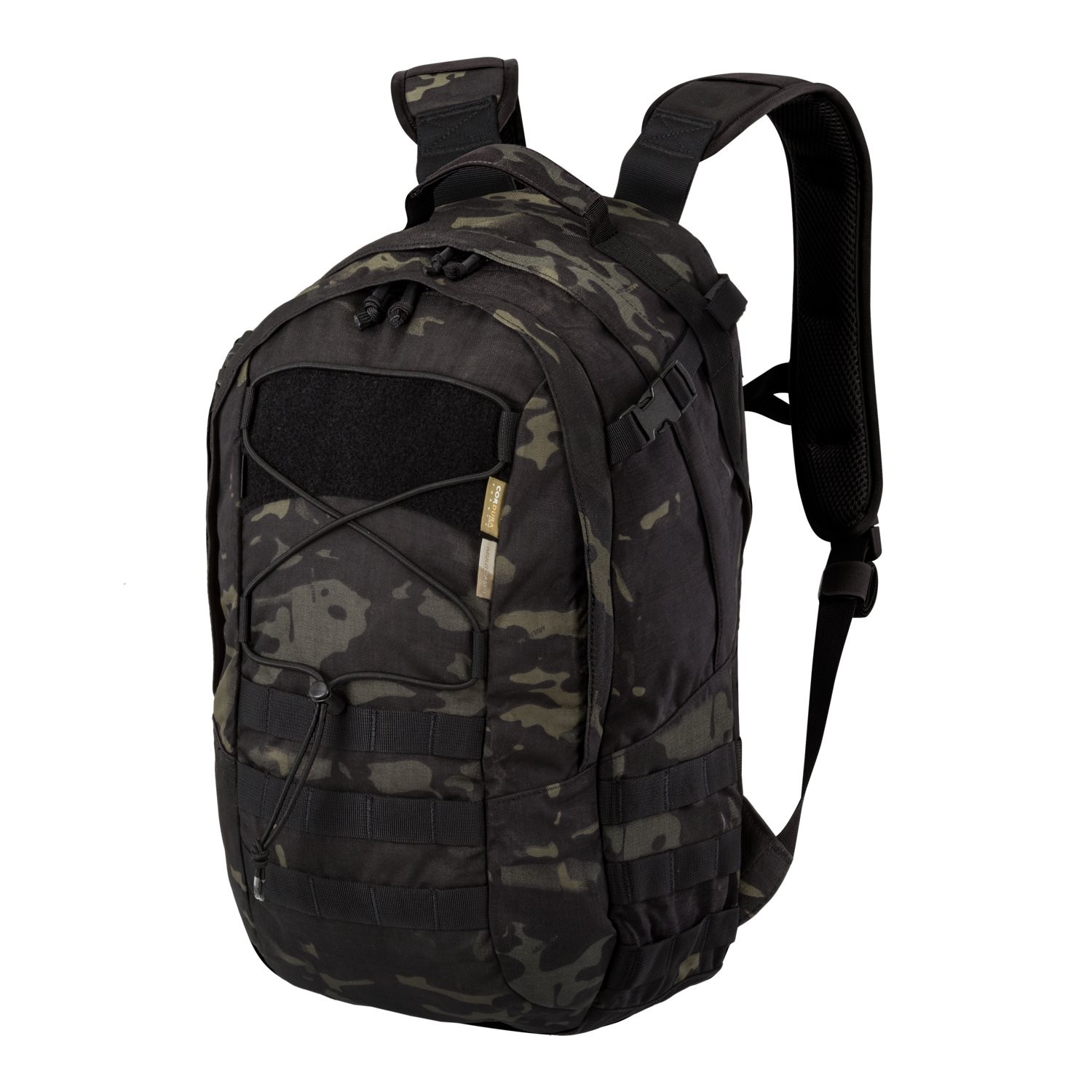 Ở phía trước, bạn sẽ tìm thấy một bảng khóa dán lớn để gắn patch và thẻ ID, cũng như một dây chun đàn hồi để cố định áo khoác hoặc áo hoodie mà không chiếm không gian bên trong. Các hàng MOLLE/PALS bổ sung ở phía trước và hai bên cho phép bạn mở rộng ba lô với các mô-đun bổ sung – chẳng hạn như túi đựng, túi bên hông hoặc bộ dụng cụ y tế.