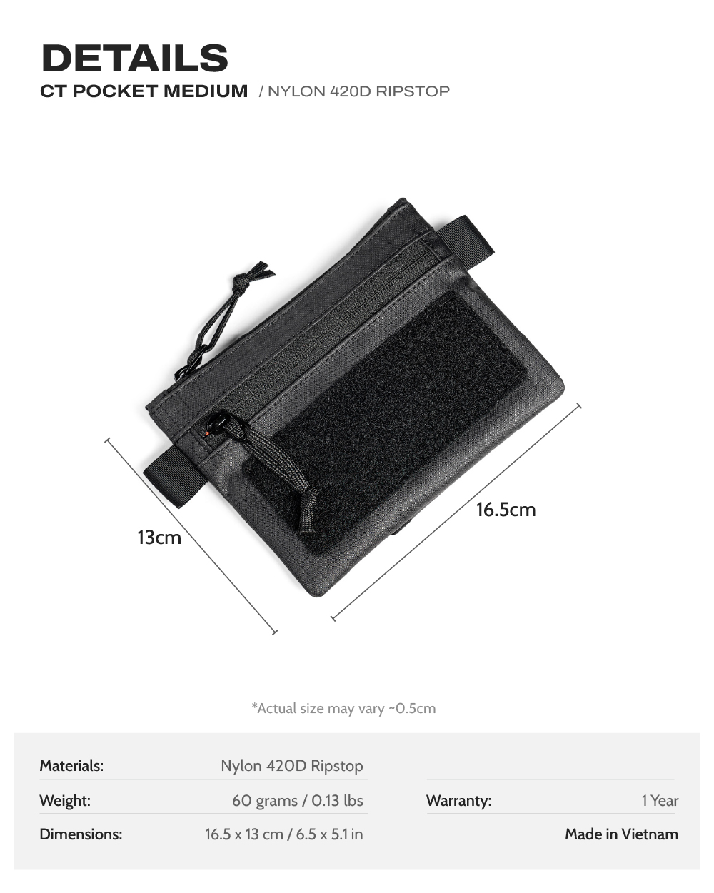 Chất liệu : Nylon 420D Ripstop, vải lót Nylon 210D Ripstop.