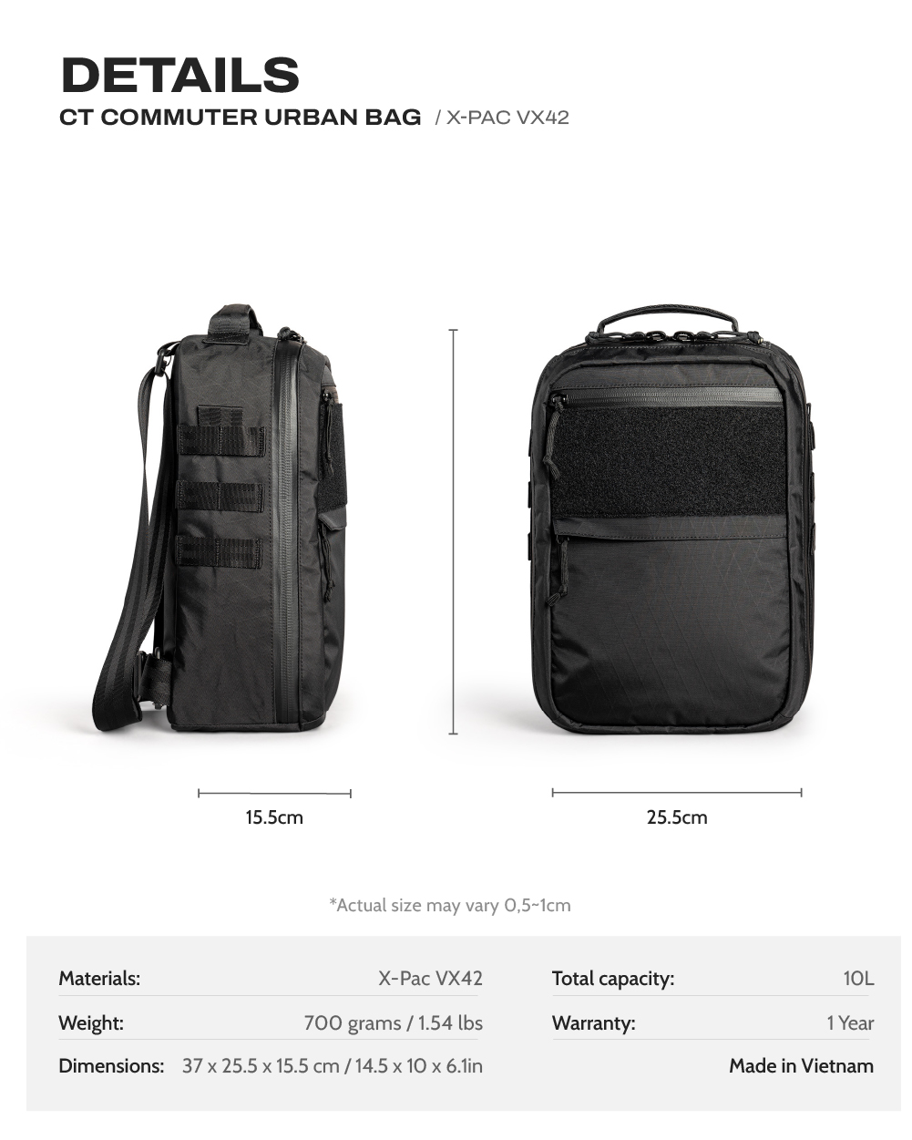 Được chế tạo từ chất liệu Dimension Polyant X-Pac VX42 bền chắc, túi CT Commuter Tactical Bag kết hợp vẻ ngoài cổ điển với thiết kế đô thị hiện đại.