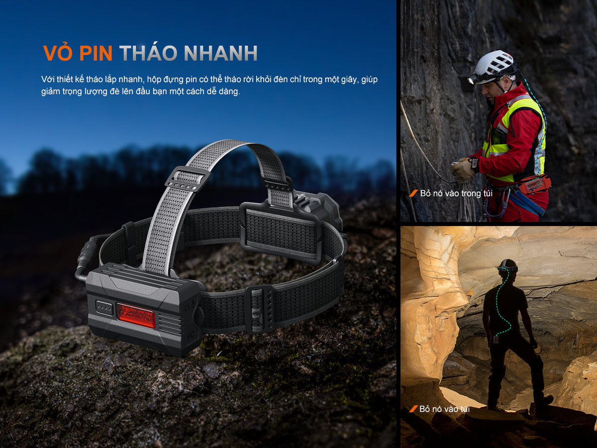 Đèn pin Fenix HP35R được thiết kế với cụm đèn và pin được tách biệt thành 2 phần. Việc này giúp trọng lượng được dàn trải đều ra 2 phía, giúp chúng ta thoải mái sử dụng lâu dài mà không bị khó chịu.