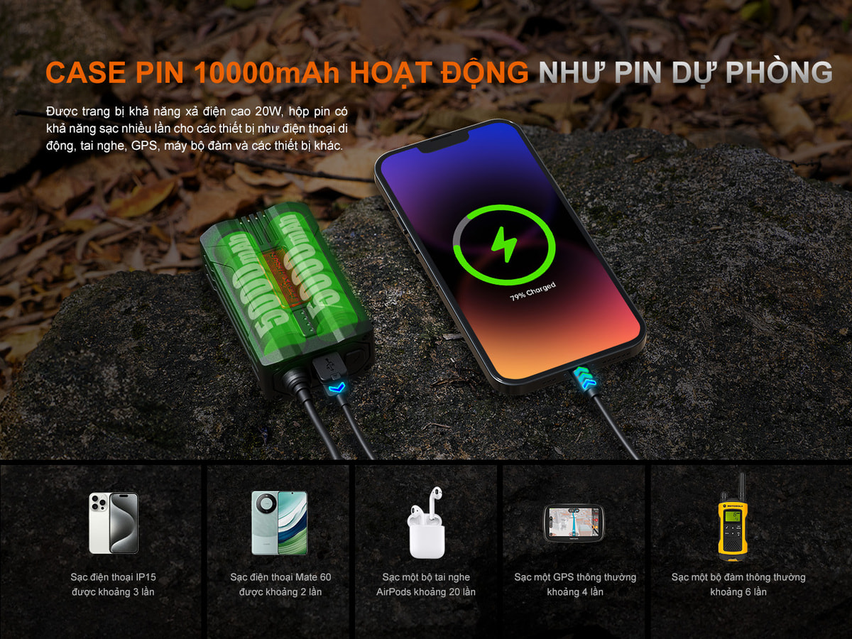 Đèn pin Fenix HP35R sử dụng 1 pack pin bố trí phía sau đầu, có nguồn 7.2 vol và dung lượng 5000mAh.