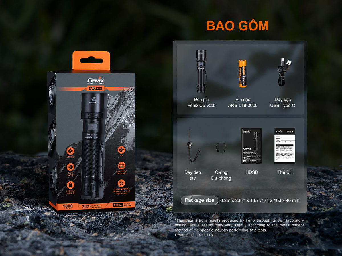 - Fenix C5 V2.0 được phát triển như một công cụ chiếu sáng đúng nghĩa: thiết kế tối giản, thao tác trực quan, tập trung hoàn toàn vào hiệu suất và tính thực tế. Với công suất tối đa 1800 lumens và khả năng chiếu xa tới 327 mét, C5 V2.0 đủ mạnh để đáp ứng hầu hết các tình huống từ đi lại ban đêm, sửa chữa, dã ngoại cho tới trekking hay làm đèn dự phòng khi cần.