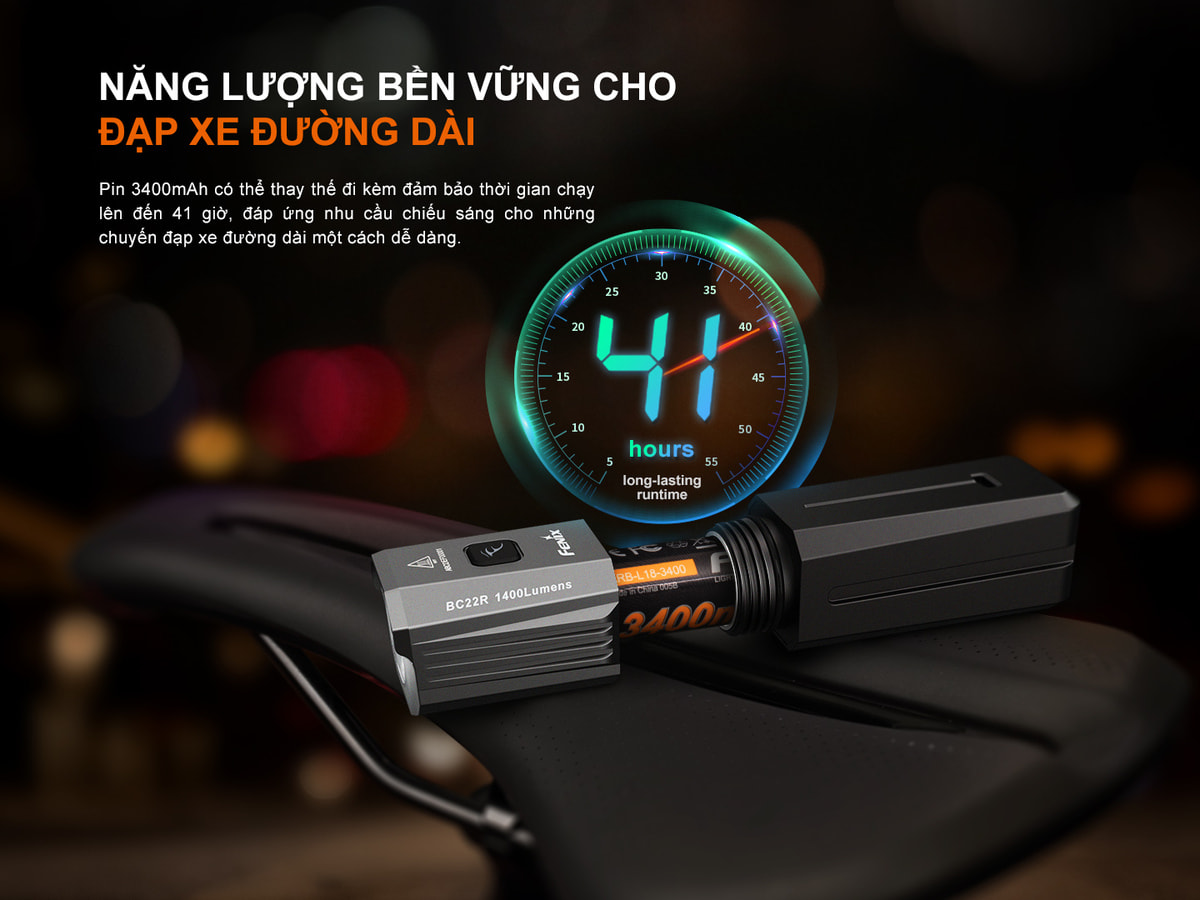 Đèn sử dụng 1 viên pin sạc 18650 có dung lượng 3400mAh, thời lượng sáng tối đa 11 giờ (mức Medium) và lên tới 41 giờ (mức thấp). Đèn Fenix BC22R dư khả năng cung cấp ánh sáng liên tục cho 1 đêm di chuyển.