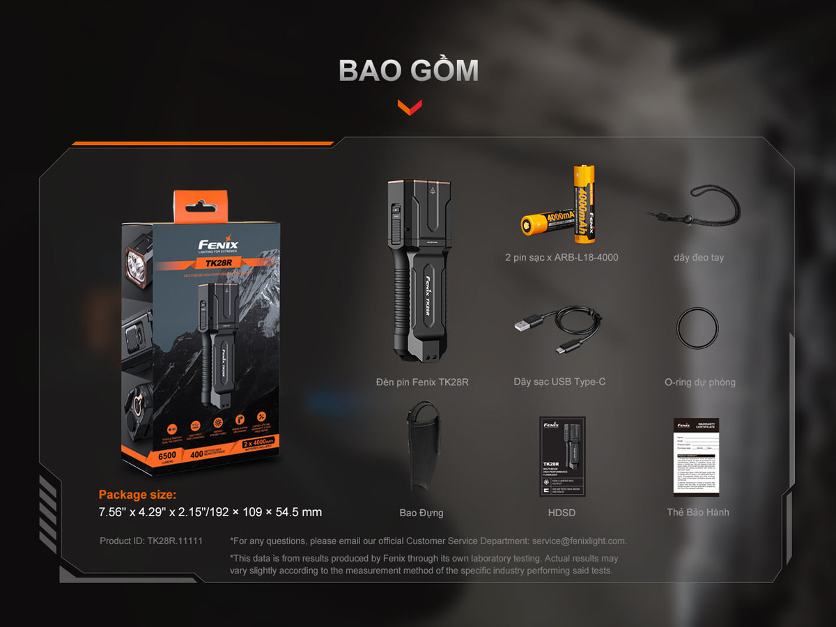 Bộ sản phẩm đèn pin Fenix TK28R bao gồm