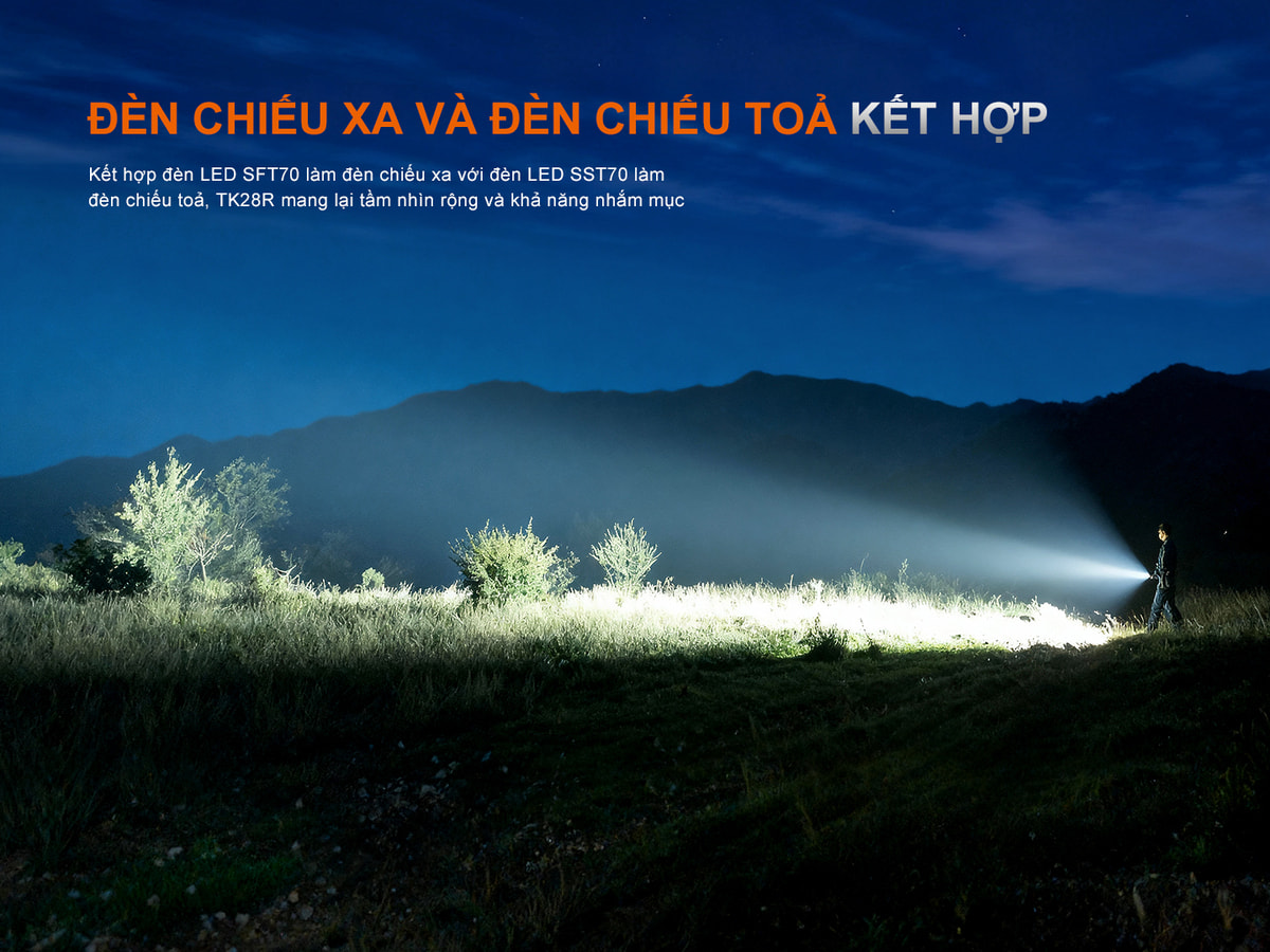Fenix TK28R kết hợp hai loại LED hiệu suất cao gồm Luminus SFT70 (chiếu xa – Spot Light) và SST70 (chiếu tỏa – Flood Light), mang đến khả năng kết hợp ánh sáng xa và rộng trong cùng một thân đèn.
