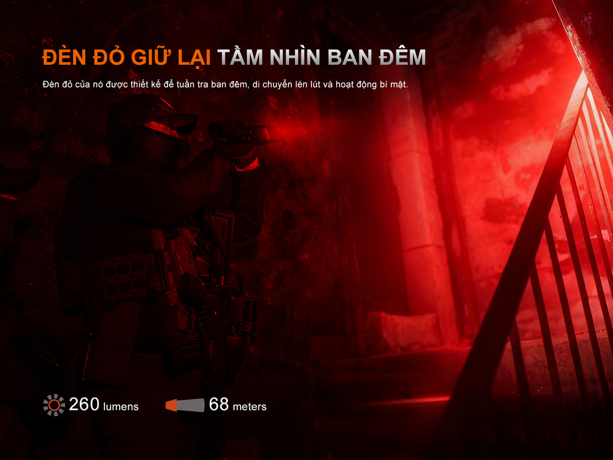 TK28R trang bị đèn đỏ công suất cao lên tới 260 lumens, chiếu xa tới 66 mét – lý tưởng cho quan sát ban đêm, tín hiệu cảnh báo, đánh dấu vị trí, hoặc hỗ trợ các hoạt động ngoài trời, câu cá…