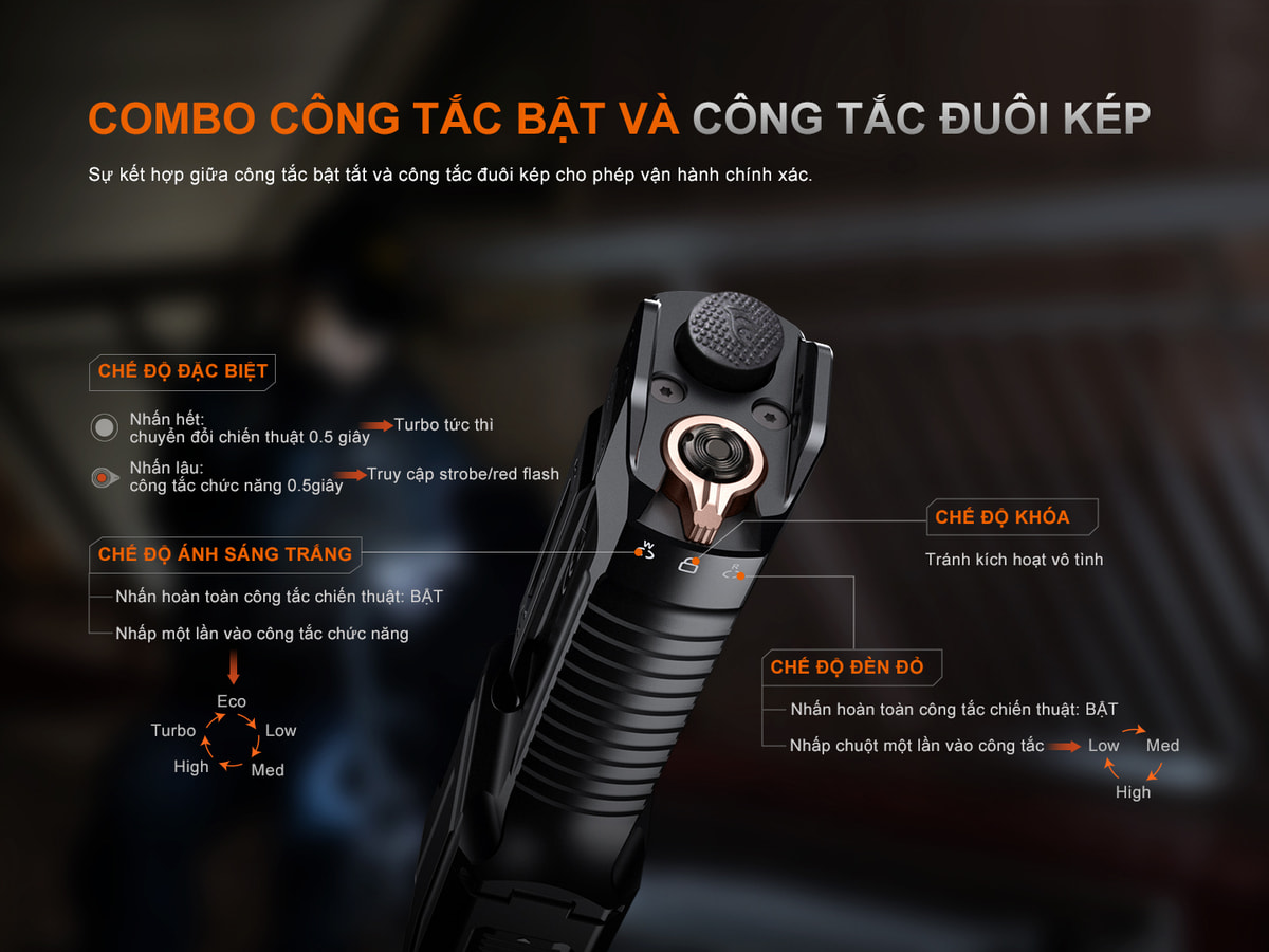 Nhấn giữ công tắc phụ: kích hoạt ngay chế độ Strobe – đèn chớp chiến thuật.