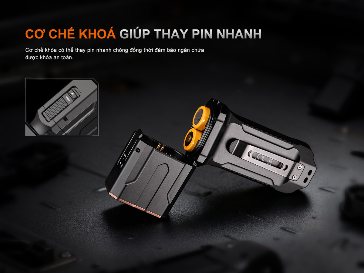 Cơ chế Break-Action mới cho phép thay pin cực nhanh chỉ bằng một thao tác nhấn mở, lần đầu tiên Fenix áp dụng trên dòng đèn cầm tay chiến thuật.
