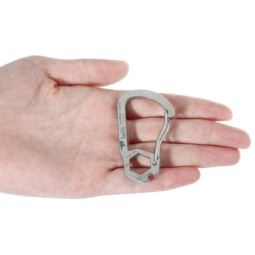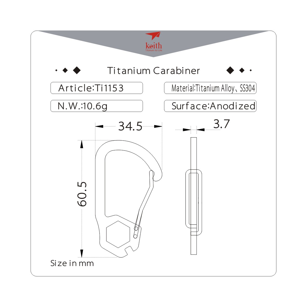 Móc khóa Keith Titanium Ti1153 có khả năng chịu tải dọc tối đa 100 kg, chỉ nặng 10,6 gram và đi kèm với cờ lê lục giác 12 mm và cờ lê nan hoa 3 mm.