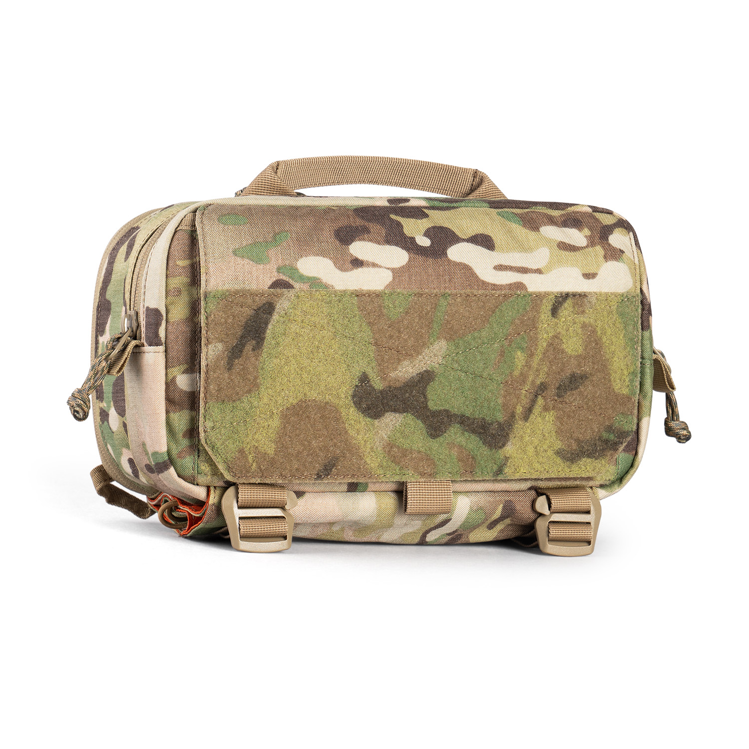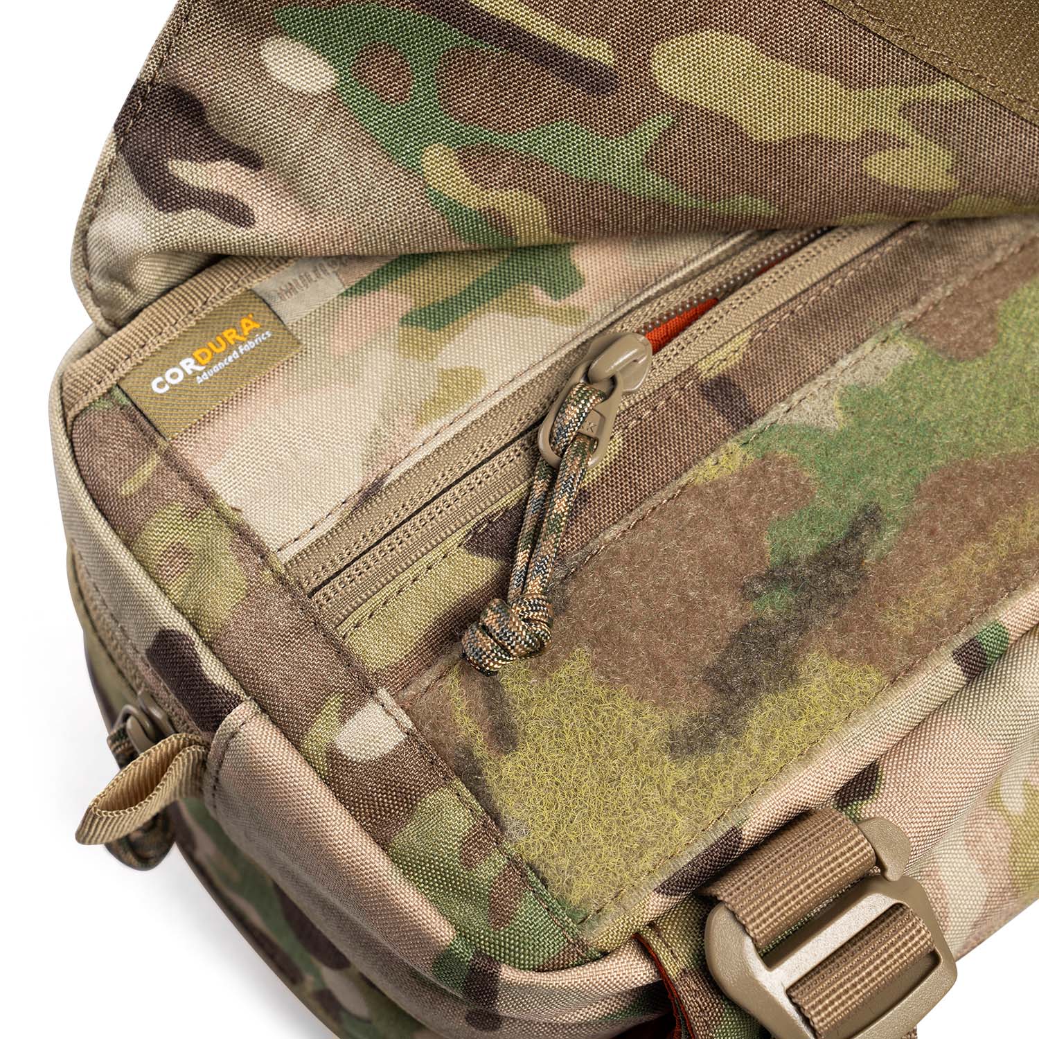 Ngăn ngoài cùng: có nắp đậy, trên nắp đậy một dải gai dán lớn để dán patch trang trí. Nắp này có thể cất vào bên trong ngăn phụ phía trước để “biến hóa” chiếc túi đeo CT5 trông khác biệt hơn và vẫn có thể sử dụng được ngăn phẳng phụ phía trước.