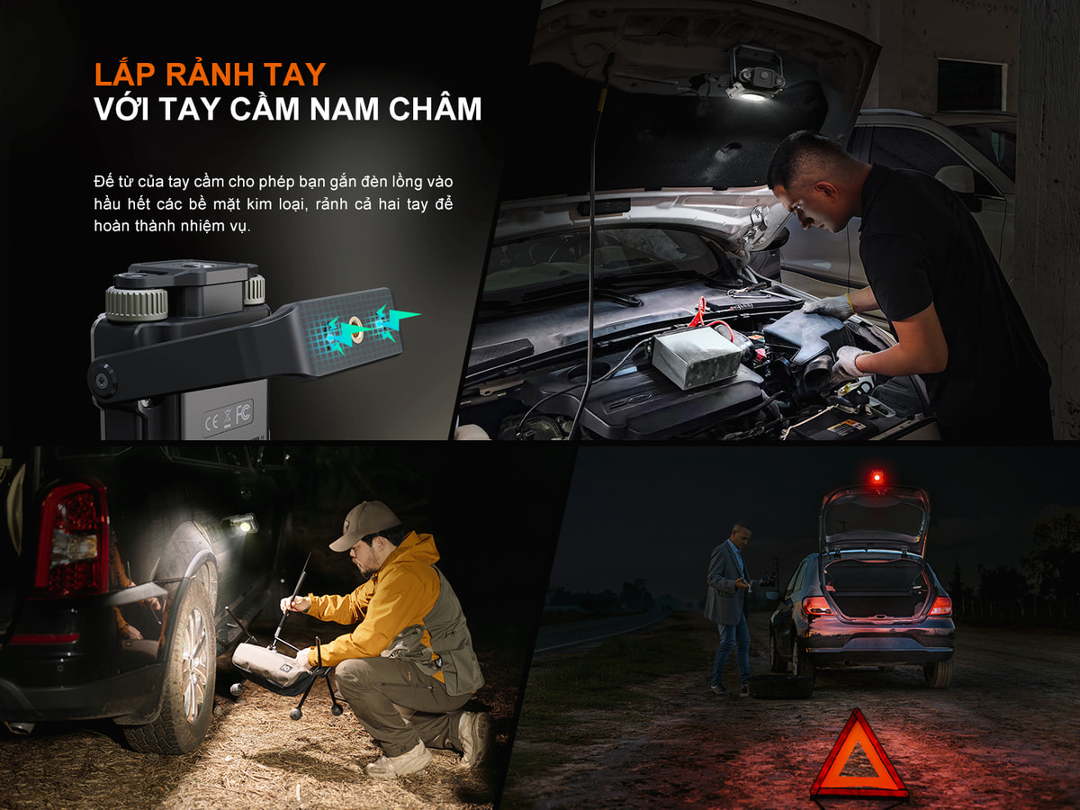 Đèn pin Fenix CL27R có quai xách xoay 360 tích hợp nam châm siêu khỏe và chân ốc ¼ inch, hỗ trợ kết nối nhiều vị trí thuận tiện cho các tác vụ làm việc và điều chỉnh hướng sáng dễ dàng.