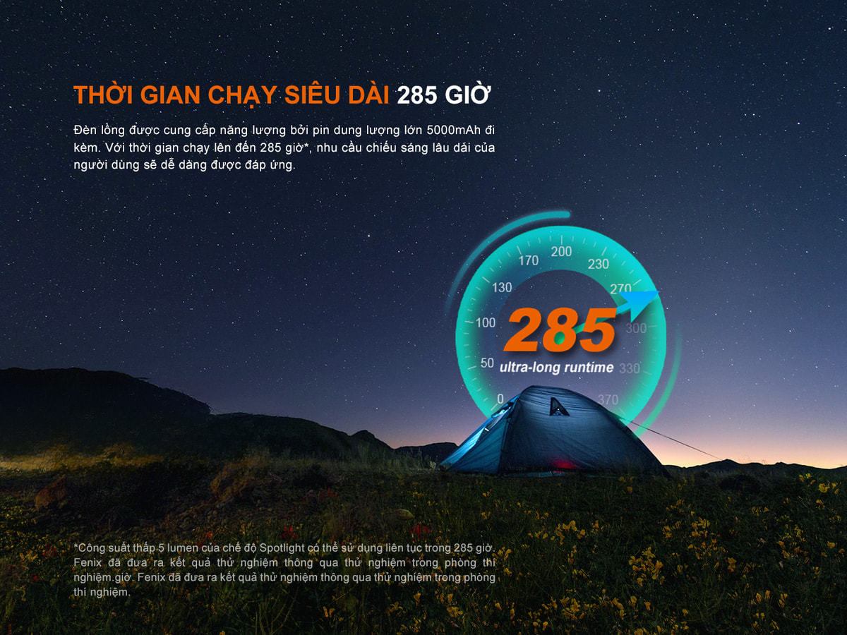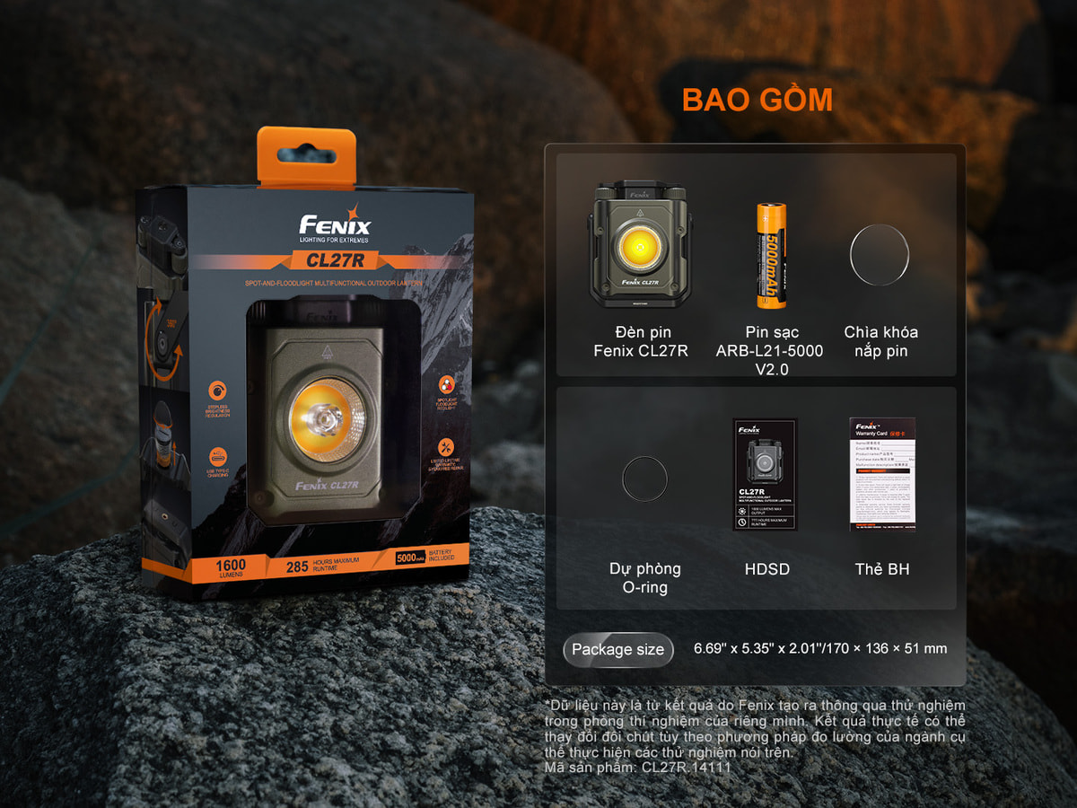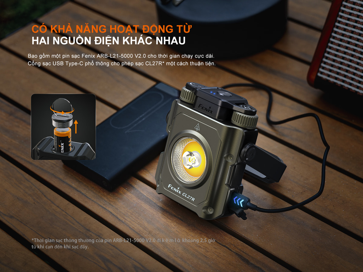 Đèn Fenix CL27R sử dụng 1 viên pin sạc 21700 dung lượng 5000mAh và có thể tháo rời. Đèn có thể sáng tối đa được 285 giờ (ở mức thấp).