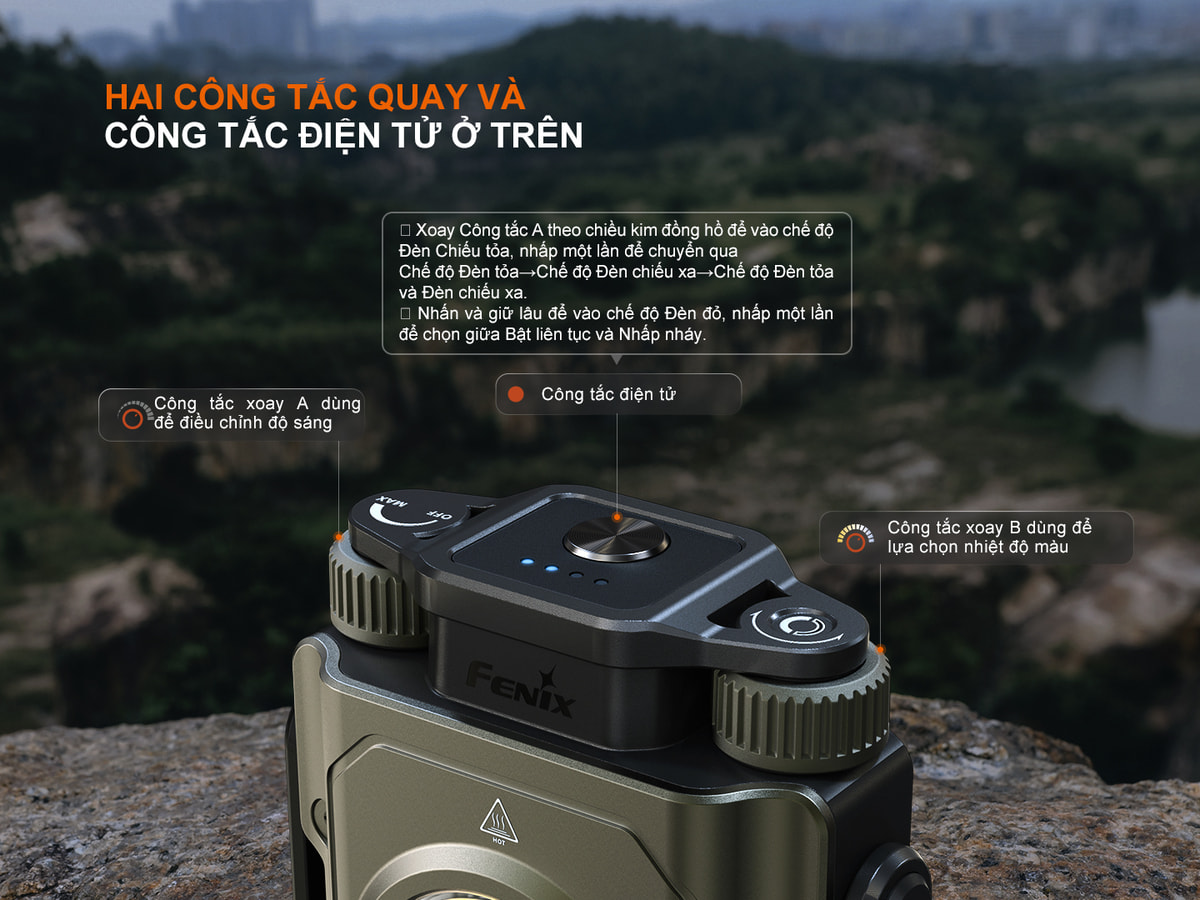 Công tắc Xoay A: Bật/Tắt đèn chính và thay đổi mức sáng.